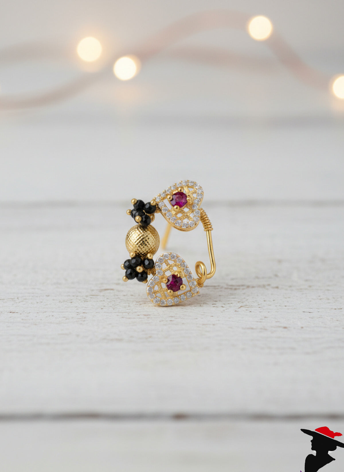 Add a touch of roval Maharashtrian heritage to vour look with this exquisitely handcrafted Nath. Featuring a classic floral motif, this nose ring is adorned with shimmering white stones and a rich ruby-red center. The signature "Guchhedar' clustered) pearl work at the top creates a majestic arch, making it a perfect statement piece for any traditional ensemble.
